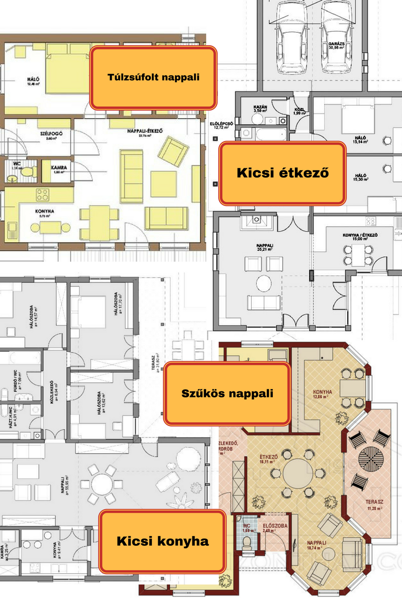Mutatok még alaprajzokat ahol jól látszik a helyiségek fontossági sorrendje! Ezek az alaprajzok nem feltétlenül rosszak, csak más prioritások és lehetőségek mentén készültek.